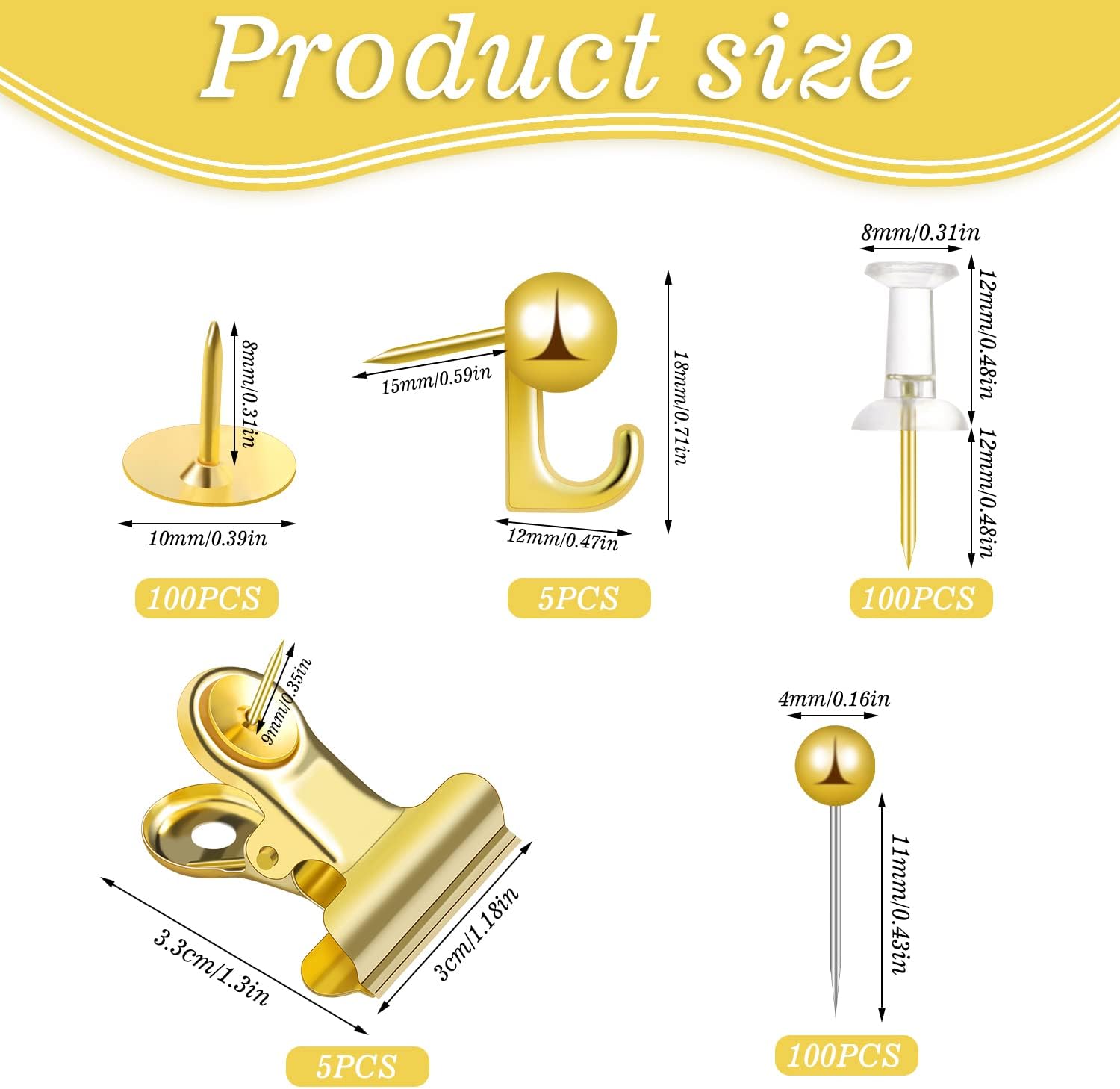 Material of other parts: Pushpin hooks, pushpin clips and other parts may be made of metal or alloy, and the surface is also treated with gold. The structure is sturdy and can withstand items of a certain weight, such as photos, small note boards, etc.
